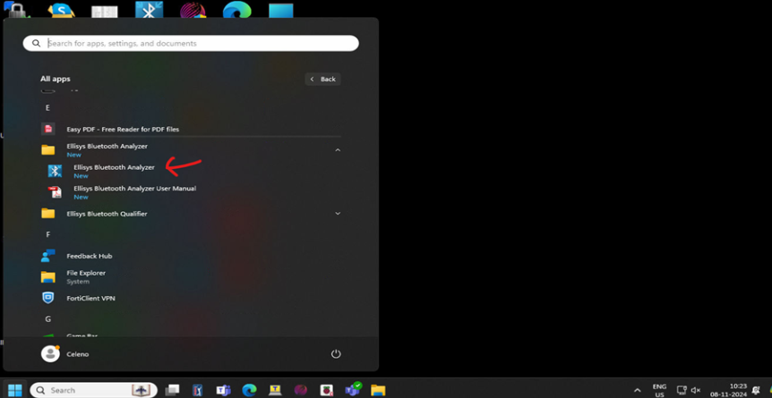 1. Once you have installed the analyzer software on Windows PC, open the software app by pressing the Windows start menu. Select and open the “Ellisys Bluetooth Analyzer”