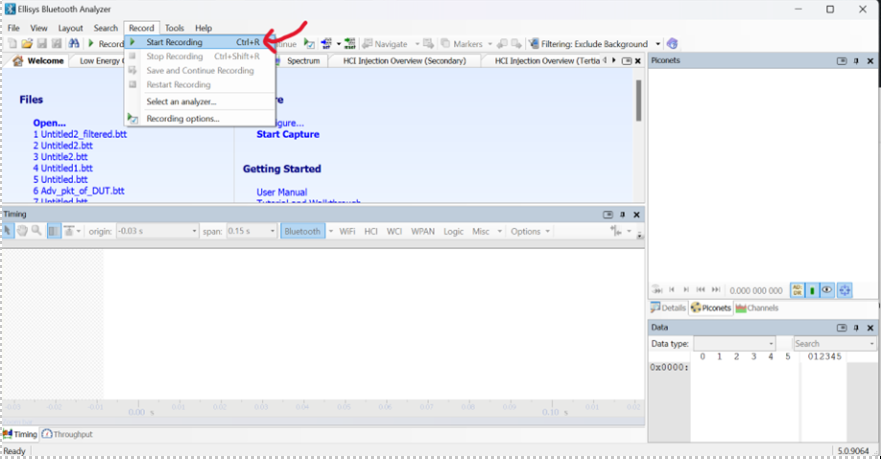 2. After the analyzer app is opened, Select Start Recording from Record menu