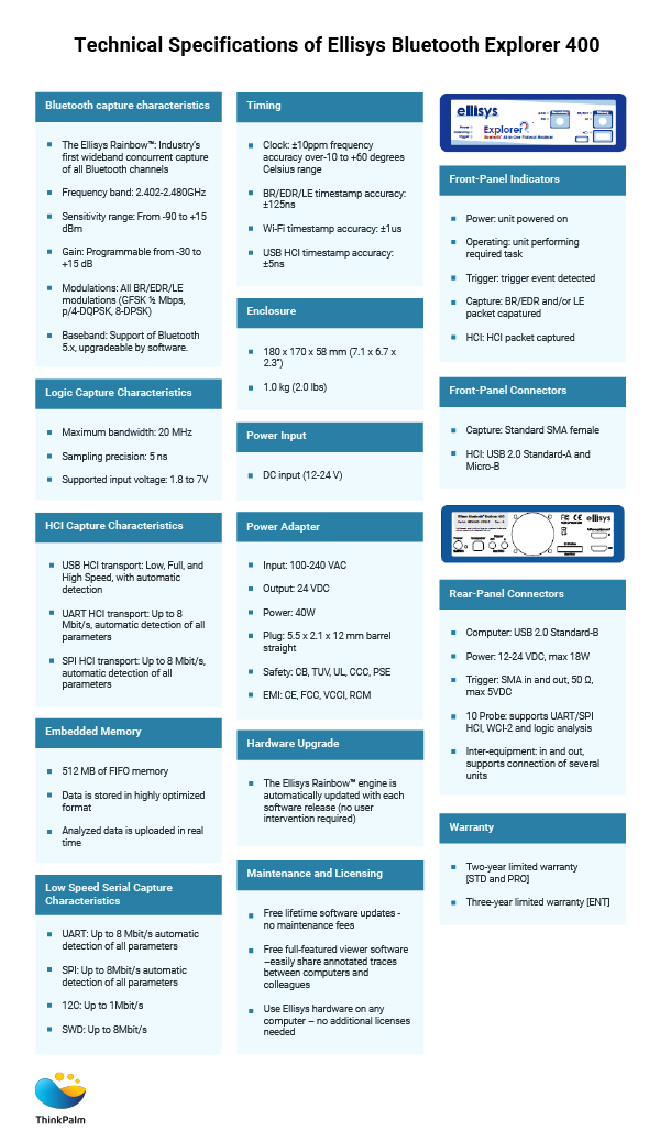 Let’s see the technical specifications of Ellisys Bluetooth Explorer 400 below: