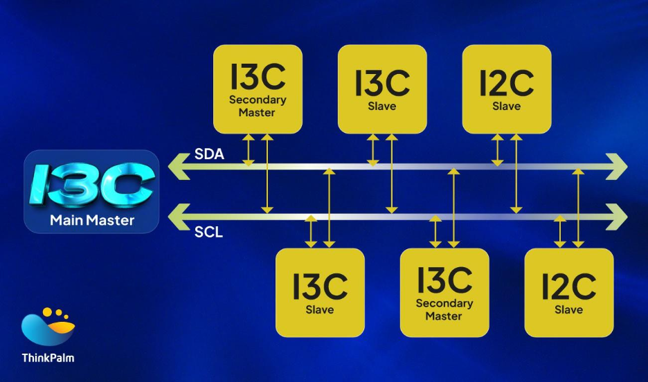 How I3C connects multiple masters and mixed devices on the same two-wire bus.