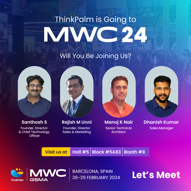 ThinkPalm Technologies is attending MWC 2024, the world’s most acclaimed mobile and connectivity event, scheduled to be held in Barcelona from 26 February to 29 February 2024.