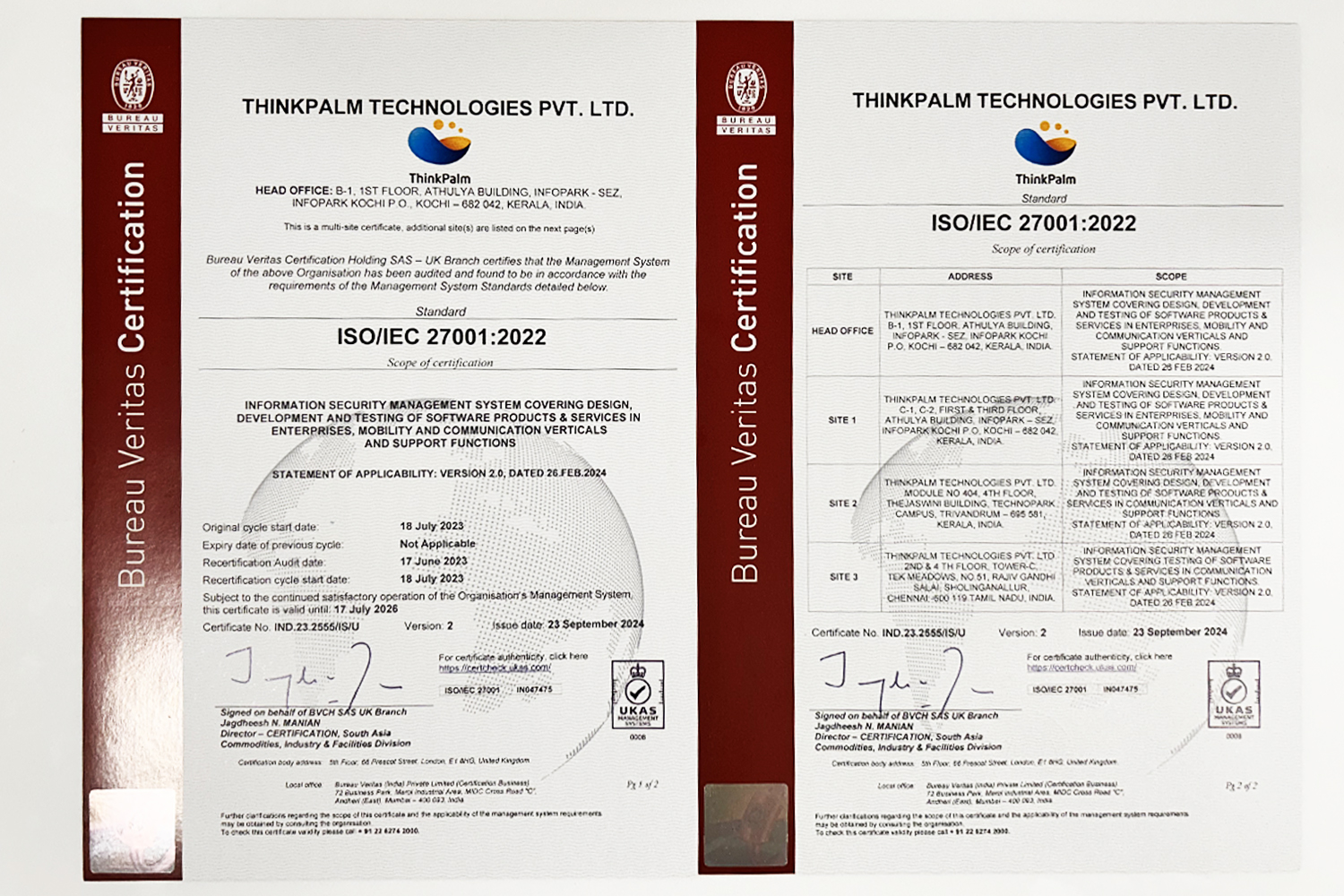 ThinkPalm Technologies is proud to have received the most prestigious revised ISO 27001:2022 standard certification. The new recognition reinforces ThinkPalm’s position as a front-runner in information technology services. One of the most coveted ISO certifications from Bureau Veritas, the certification is solid evidence of ThinkPalm’s staunch commitment to prioritizing the highest levels of information security. Additionally, it symbolizes the complete protection of sensitive information for its clients and employees.